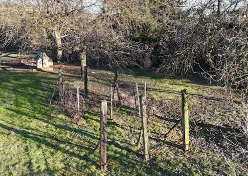 Das große Grundstück, das in vier Parzellen aufgeteilt ist, bietet hervorragende Möglichkeiten für Gartenarbeit, Landwirtschaft oder weitere Bebauung.