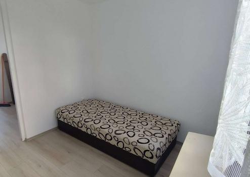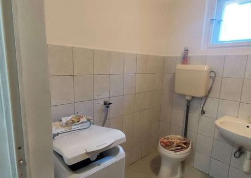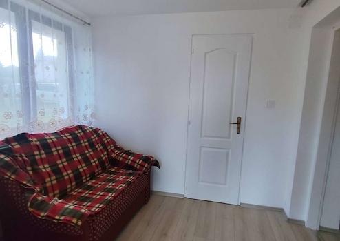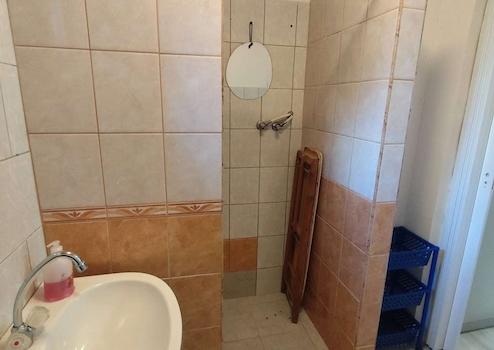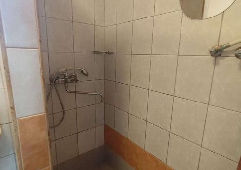 Geheizt wird im kleineren Zimmer mit einem Gaskonvektor und im Wohnzimmer mit einem großen Kachelofen. Warmwasser liefert ein elektrischer Boiler.