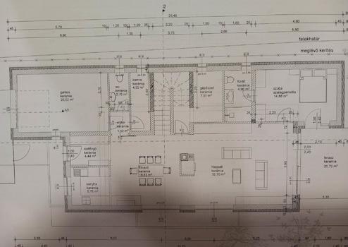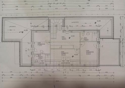 Térbeosztása: telek: 681 m2, lakóépület: 178 m2, földszinti terasz: 21 m2, emeleti teraszok 32 m2, 18 m2