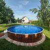 Az udvaron gyümölcsfák, illetve egy félig süllyesztett medence is van.
