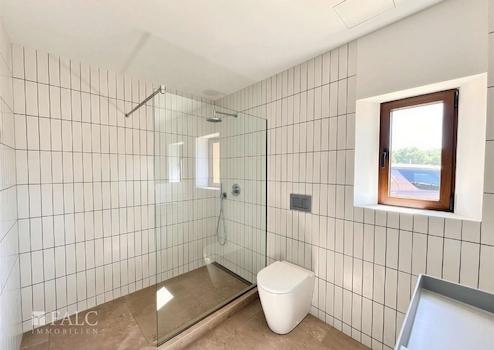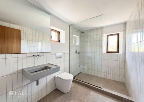 Insgesamt verfügt das Anwesen über fünf komfortable Schlafzimmer. Vier davon befinden sich im Erdgeschoss, drei mit Bad en suite. Im Obergeschoss erwartet Sie die großzügige Master-Suite mit eigenem Bad sowie zwei privaten Terrassen, die einen beeindruckenden Blick auf die umliegende Landschaft und die Region Santanyí bieten.