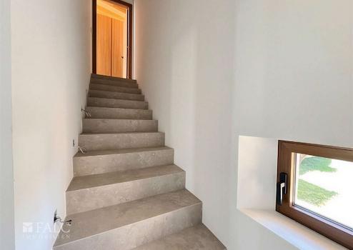 Die elegante Natursteinfassade wird durch großzügige Fensterfronten ergänzt, die lichtdurchflutete Räume und fließende Übergänge zwischen Innen- und Außenbereich ermöglichen. Das Herzstück des Hauses bildet der offen gestaltete Wohn- und Essbereich mit Kamin, der nahtlos in eine moderne, voll ausgestattete Küche mit Kochinsel und edlen Naturstein-Arbeitsplatten übergeht.