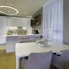Die Küche ist mit modernen Einbaugeräten ausgestattet, darunter Backofen, Induktionskochfeld, Geschirrspüler, Dunstabzugshaube und kombiniertem Kühlschrank mit Gefrierfach. Die Möbel sind maßgefertigt - sie umfassen niedrige und hohe Küchenschränke sowie eine Kücheninsel mit Arbeitsplatte aus weißem Quarz. An der Insel sind auch Barhocker angebracht, die zur Funktionalität und zum modernen Design des Raumes beitragen.