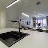 Die Küche ist voll ausgestattet mit modernen Einbaugeräten, darunter ein Backofen, ein Induktionskochfeld, eine Geschirrspülmaschine, eine Dunstabzugshaube und ein Kombi-Kühl- und Gefrierschrank. Die Möbel sind maßgefertigt - sie umfassen Unterschränke und Hängeschränke sowie eine Kücheninsel mit einer Arbeitsplatte aus weißem Quarz. An der Insel sind auch Barhocker angebracht, die zur Funktionalität und modernen Gestaltung des Raumes beitragen.