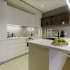 Die Küche ist komplett ausgestattet mit modernen Einbaugeräten wie Backofen, Induktionskochfeld, Geschirrspüler, Dunstabzugshaube und Kombi-Kühlschrank mit Gefrierfach. Die Möbel sind maßgefertigt und umfassen Unterschränke, Oberschränke und eine Kücheninsel mit Arbeitsplatte aus weißem Quarz. An der Insel sind auch Barhocker angebracht, was zur Funktionalität und modernen Gestaltung des Raums beiträgt.