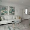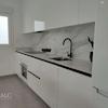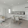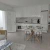 High-End-Küche: Weiße Design-Schränke mit LED-Unterbauleuchten und hochwertigen Markengeräten (Kühl-Gefrierkombi, Geschirrspüler, Induktion etc. inklusive).