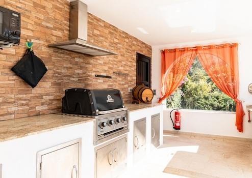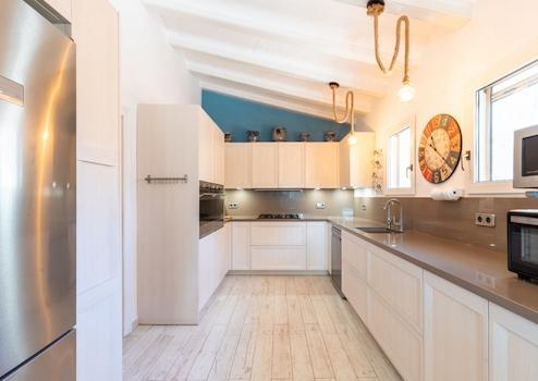 Das Herzstück des Hauses bilden ein großzügiges Wohnzimmer und ein Esszimmer, die speziell für Unterhaltung und soziale Aktivitäten gestaltet sind, ausgestattet sowohl mit einem Gaskamin als auch mit einem Holzofen. Die Küche, ausgestattet mit hochwertigen Geräten, verfügt über einen privaten Weinkeller und einen separaten Hauswirtschaftsraum. In Bezug auf Nachhaltigkeit hebt sich das Anwesen durch die Installation von 15 Solarpanelen hervor, die das gesamte Haus mit Energie versorgen, ergänzt durch eine zentrale Fußbodenheizung und eine Kälte-/Wärme Klimaanlage.