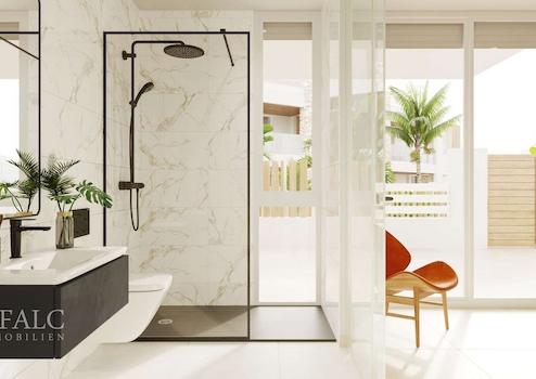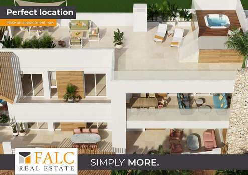 Die Erdgeschoss-Modelle verfügen über einen großzügigen, privaten Gartenanteil – ideal für Sonnenanbeter und Hundebesitzer. Die Obergeschoss-Modelle bieten hingegen ein beeindruckendes, privates Solarium auf dem Dach, das einen weiten Blick über die Anlage und die Umgebung ermöglicht. Beiden Typen gemein ist das offene, lichtdurchflutete Wohnkonzept, das die Küche, den Essbereich und den Wohnraum zu einer harmonischen Einheit verschmilzt. Große Fensterfronten sorgen für ein helles, freundliches Ambiente und eine nahtlose Verbindung zum Außenbereich.