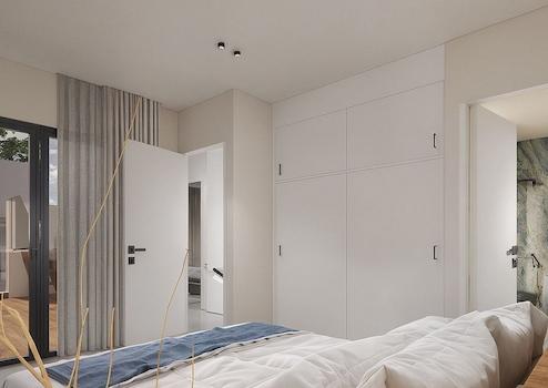 Im Obergeschoss befinden sich zwei geräumige Schlafzimmer, jedes mit eigenem Bad, eines davon en suite. Beide Schlafzimmer haben Zugang zu einer privaten offenen Terrasse von 17 m². Für diejenigen, die noch mehr Platz im Freien wünschen, gibt es gegen Aufpreis ein optionales Dachsolarium.
