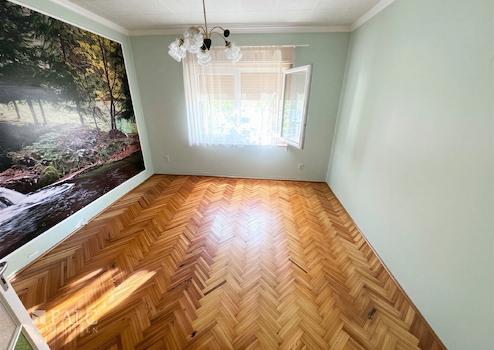 Es verfügt über drei Schlafzimmer, zwei Halbzimmer, ein Wohnzimmer, eine Küche, einen Flur, eine Speisekammer, ein Badezimmer und ein separates WC.