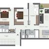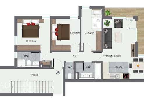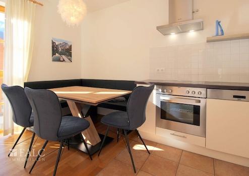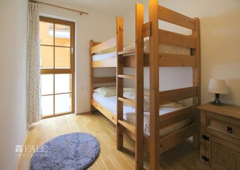 Aufgeteilt ist die Wohnung in eine offene Küche im Wohn- und Essbereich mit Ausgang auf den nach Südwesten ausgerichteten Balkon mit Blick in die Berge und auf den Skihang. Drei Schlafzimmer, zwei Badezimmer, davon eines mit Duschwanne sowie zwei Waschbecken und das andere mit Dusche ergänzt durch ein separates WC runden das durchdachte Raumkonzept ab.