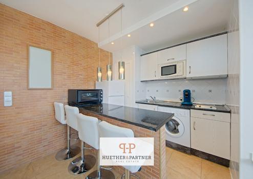 Durch die Ausrichtung wirkt die Wohnung besonders lichtdurchflutet. Eine nachträglich integrierte Theke trennt die Küche optisch vom Wohnbereich, schafft zusätzliche Arbeitsfläche und kann zugleich als Essplatz genutzt werden.