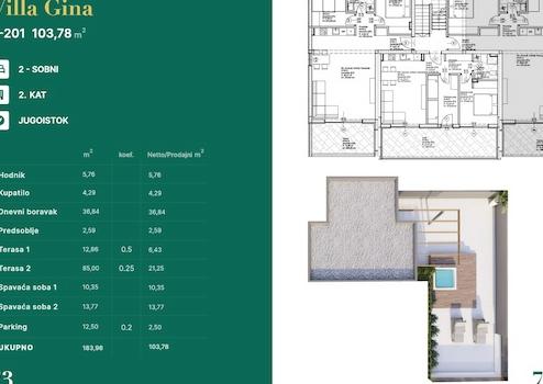 Wir verkaufen ein Penthouse-Apartment mit Dachterrasse im zweiten Obergeschoss (S201) eines Neubaus in Privlaka bei Zadar (Südausrichtung).