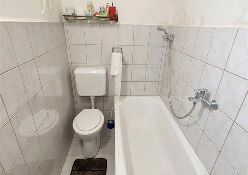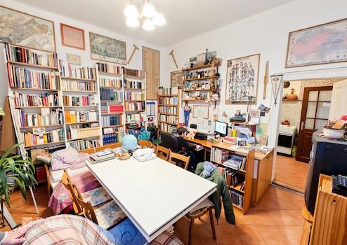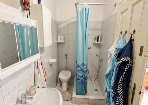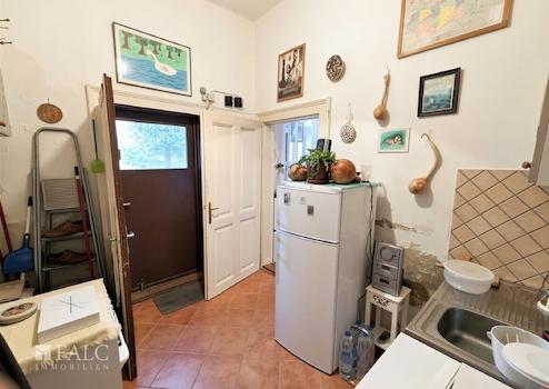 Das angrenzende jetzige Büro verfügt über einen getrennten Eingang über den Innenhof, einen Vorraum und ein getrenntes Badezimmer mit WC und Wanne.