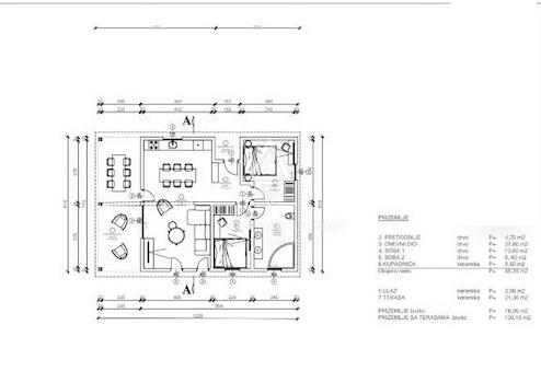Das Haus ist ebenerdig konzipiert und verfügt über eine Wohnfläche von 100 m². Die Raumaufteilung umfasst einen Eingangsbereich, ein helles und geräumiges Wohnzimmer mit offener Küche und Essbereich, zwei komfortable Schlafzimmer, ein Badezimmer sowie eine angenehme Terrasse, die zum Verweilen im Freien einlädt.