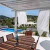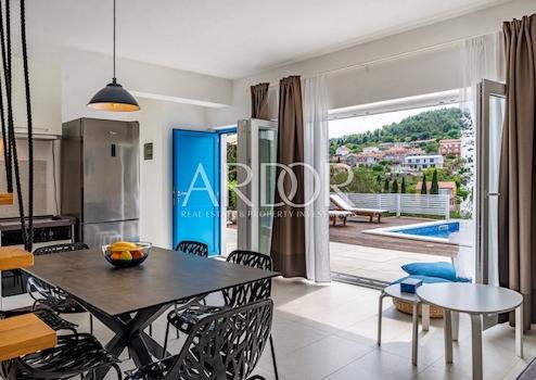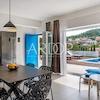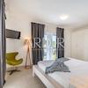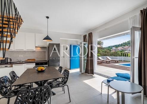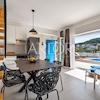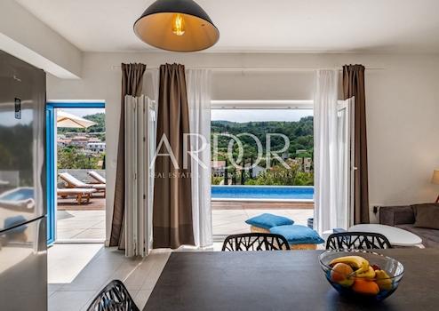 Das Interieur der Villa ist mit hochwertigen, sorgfältig ausgewählten Möbeln ausgestattet, überwiegend aus Eichenholz, während die Außenmöbel aus Teakholz gefertigt sind. Die maßgefertigte Küche ist mit Bosch-Geräten ausgestattet, und das Geschirr sowie ein Teil der Badezimmereinrichtung stammen von renommierten Herstellern wie WMF und Villeroy & Boch. Erstklassige italienische Keramik und Sanitäranlagen wurden installiert und gewährleisten ein hohes Maß an Ästhetik und Langlebigkeit. Alle Schlafzimmer und Wohnräume sind mit Smart-TVs ausgestattet.
