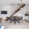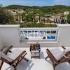 Der Hauptteil des Hauses erstreckt sich über zwei Etagen. Im Erdgeschoss befinden sich ein elegant eingerichtetes Schlafzimmer mit eigenem Bad, ein großzügiges Wohnzimmer mit moderner, voll ausgestatteter Küche sowie eine überdachte Terrasse, die idealen Raum für Geselligkeit und Entspannung bietet. Eine Innentreppe führt ins Obergeschoss, wo sich zwei komfortable Schlafzimmer befinden, jeweils mit eigenem Bad. Das Hauptschlafzimmer verfügt über einen großzügigen Balkon mit freiem Ausblick, während auch das zweite Schlafzimmer einen eigenen Balkon besitzt, was das Gefühl von Luxus und Privatsphäre zusätzlich unterstreicht.
