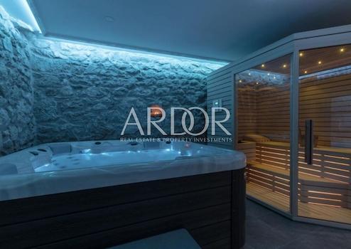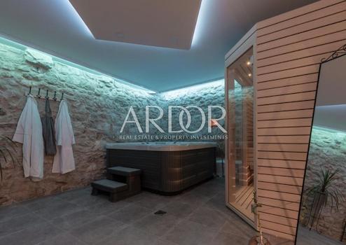 Im Erdgeschoss befindet sich ein heller, offen gestalteter Wohnbereich, der ein elegantes Wohnzimmer mit Kamin, einen großzügigen Essbereich, eine voll ausgestattete Sommerküche sowie einen Wellnessraum mit Jacuzzi und Sauna vereint.