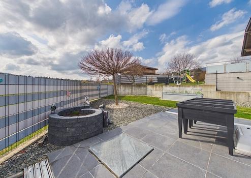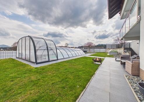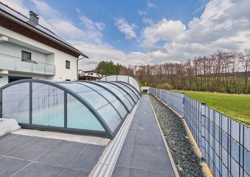 Die Außenanlage präsentiert sich stilvoll, zeitlos und zugleich funktional. Besonders hervorzuheben ist die durchdachte Gartengestaltung, die nicht nur optisch überzeugt, sondern auch auf eine einfache Bewirtschaftung ausgelegt ist. Die Vorbereitung für einen Rasenroboter unterstreicht den modernen Anspruch ebenso wie die insgesamt sehr gepflegte Ausführung. Ergänzt wird der Außenbereich durch eine hochwertige, überdachte Poolanlage in optimaler Südausrichtung, die nicht nur optisch ein Highlight darstellt, sondern auch durch eine integrierte Luftwärmepumpe beheizbar ist und somit einen erweiterten Nutzungszeitraum ermöglicht. Zwei großzügige Terrassen bieten zusätzliche Aufenthaltsflächen, die sowohl im direkten Anschluss an den Pool als auch im Bereich des Erdgeschosses ein angenehmes Verweilen im Freien ermöglichen.