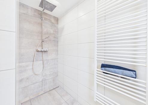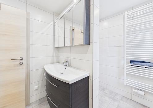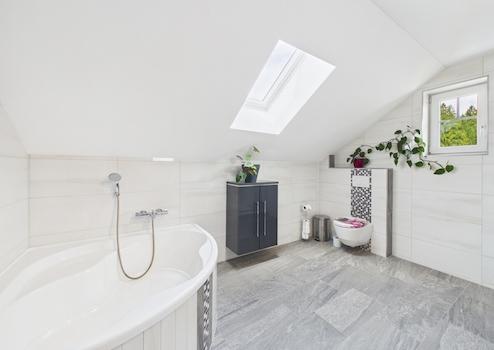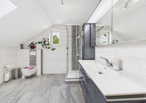 Im Obergeschoss überzeugt insbesondere das hochwertig ausgestattete Badezimmer, das mit Eckbadewanne, Dusche und einem stilvollen Waschbereich höchsten Komfort bietet. Die durchgehend modernisierten Sanitärbereiche auf allen Ebenen sowie die in den Bädern installierte Fußbodenheizung sorgen für ein angenehmes Wohnklima und unterstreichen den hohen Ausstattungsstandard dieser Immobilie.