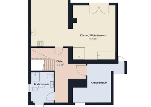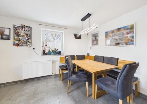Das Wohnkonzept ist klar strukturiert und zugleich großzügig angelegt. Der Wohnbereich im Erdgeschoss bietet direkten Zugang zur Terrasse und schafft eine angenehme Verbindung zwischen Innen- und Außenraum. Die Küche und der Essbereich sind funktional voneinander getrennt und bieten ausreichend Platz für den täglichen Gebrauch sowie für gesellige Zusammenkünfte. Ergänzt wird diese Ebene durch ein Arbeitszimmer, einen Wirtschaftsraum sowie moderne Sanitäranlagen.