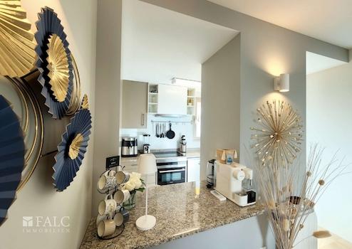 Bereits beim Betreten des Apartments empfängt Sie ein schöner Wohnbereich mit großzügigen Fensterfronten, die für eine helle und einladende Wohnatmosphäre sorgen. Die offen gestaltete und ausgestattete Küche integriert sich harmonisch in den Wohnraum und bietet alle Annehmlichkeiten für den Alltag sowie für gesellige Kochabende. Der fließende Übergang zwischen Wohnen, Essen und Kochen schafft ein modernes Raumgefühl, das trotz der kompakten Größe ein angenehmes Maß an Großzügigkeit vermittelt.