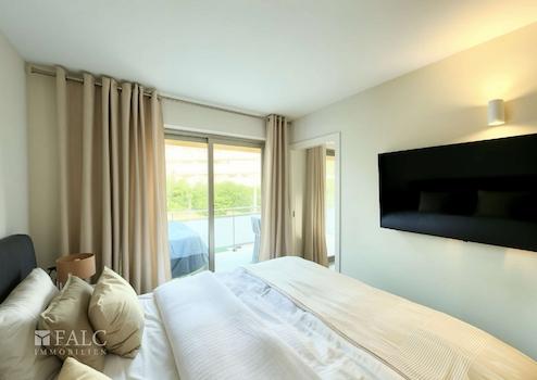 Das Schlafzimmer überzeugt mit einem hochwertigen Einbauschrank und direktem Zugang zum Balkon. Diese Verbindung zum Außenbereich verleiht dem Raum zusätzliche Helligkeit und unterstreicht das luftige Wohnkonzept. Es entsteht ein ruhiger Rückzugsort, der Komfort und Entspannung auf ideale Weise verbindet. Das moderne Badezimmer präsentiert sich mit einer stilvollen Dusche, eleganten Fliesen und hochwertigen Armaturen. Ein zusätzlicher Abstellraum sorgt für praktischen Stauraum und rundet das durchdachte Raumangebot ab.