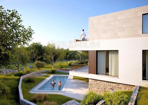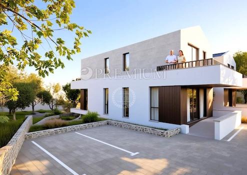 In ruhiger Lage in der Umgebung von Vrbnik, am Rand der Bauzone, befindet sich eine moderne Doppelhaushälfte im Neubau mit einer gesamten Nettonutzfläche von 176 m², aufgeteilt auf Untergeschoss, Erdgeschoss und Obergeschoss.