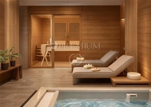 Das Untergeschoss ist als Wellness- und Entspannungsbereich gestaltet und umfasst ein Badezimmer sowie einen Wellnessbereich mit Sauna, mit Zugang zur überdachten Terrasse und zum Garten, auf dem ein Pool (8 × 3,5 m) vorgesehen ist.
