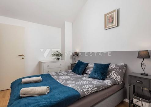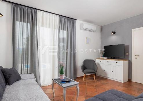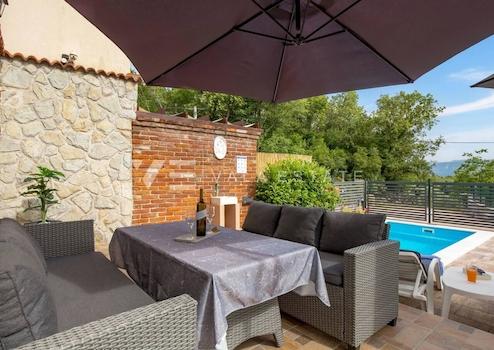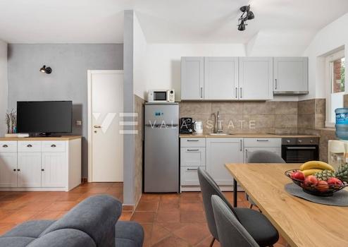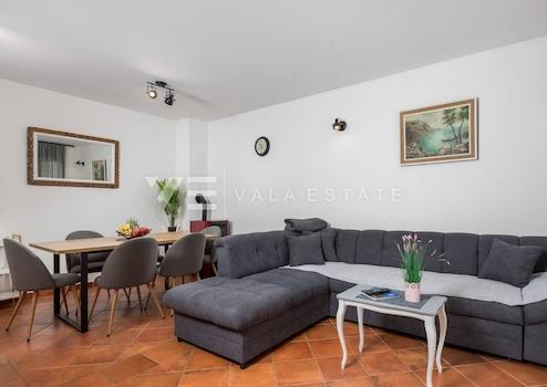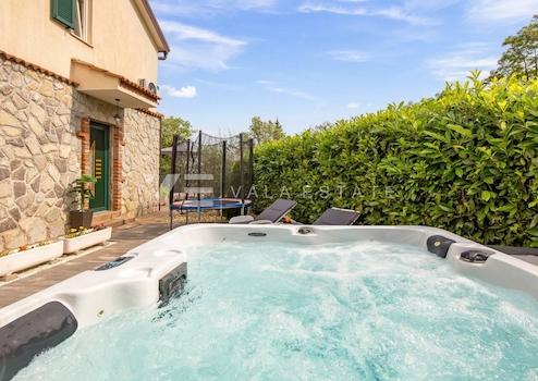 Immobilien auf der Insel Krk, Bucht von Soline – in einem kleinen Dorf am Rande der Grünzone bei Soline steht ein neueres, teilweise aus Stein erbautes mediterranes Doppelhaus zum Verkauf, umgeben von einem wunderschönen Garten und unberührter Natur. Das Haus bietet 130 m² Wohnfläche und besteht aus Keller, Erdgeschoss und ausgebautem Dachgeschoss. Im Keller befinden sich ein Abstellraum und ein als Aufenthaltsraum gestalteter Keller. Das Erdgeschoss umfasst eine Eingangshalle, ein Badezimmer, eine Küche mit Essbereich und ein Wohnzimmer mit Zugang zur Terrasse und zum Garten. Eine Innentreppe führt in den ersten Stock mit einem Badezimmer und zwei Schlafzimmern, die Zugang zu einer Loggia mit Blick in die Natur bieten. Der 270 m² große, wunderschön angelegte Garten mit harmonisch in die Landschaft integrierten mediterranen Pflanzen bietet zwei Terrassen, einen Grillplatz, einen Whirlpool, einen Swimmingpool mit Liegewiese und Sommerdusche sowie drei Parkplätze. Dieses charmante Haus im mediterranen Stil ist ideal für alle, die einen ruhigen Urlaub verbringen möchten, und bietet gleichzeitig eine attraktive Investitionsmöglichkeit zur touristischen Vermietung. Die Lage ist ruhig, umgeben von Grün und Wäldern, und nur ca. 2000 m vom Meer, wunderschönen Stränden und allen Annehmlichkeiten entfernt. Die Immobilienagentur Vala Estate Malinska sorgt für eine sichere und transparente Eigentumsübertragung und stellt Ihnen alle notwendigen Dokumente zur Verfügung.