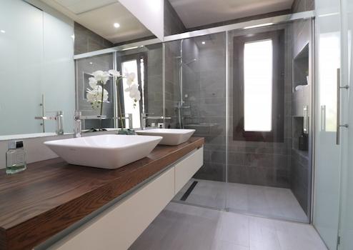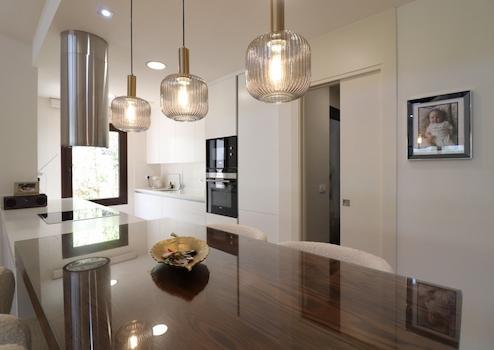 Die 2017 erbaute Villa besticht durch ihr zeitgemäßes Design und hochwertige Ausstattungsdetails. Großzügige, offene Wohnräume mit hellen Lichtverhältnissen, ein Wohnzimmer mit sichtbaren Holzbalken und große Glas-Schiebetüren schaffen ein luftiges, freundliches Ambiente. Der Essbereich führt in eine elegante, moderne Einbauküche mit Frühstücksbar und separatem Hauswirtschaftsraum. Drei Schlafzimmer mit Einbauschränken, darunter ein Master-Bedroom mit privater Terrasse und en-suite Badezimmer, bieten komfortable Rückzugsmöglichkeiten. Ein stilvolles Familienbad komplettiert das Interieur.