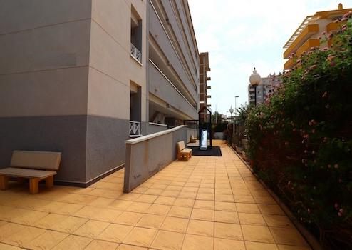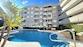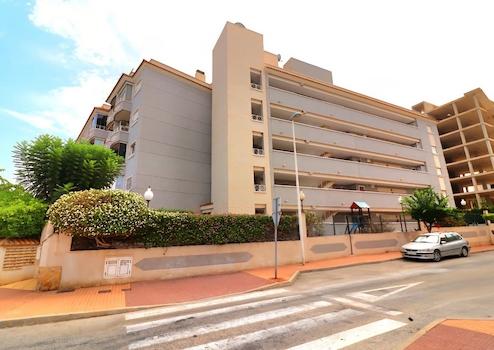 Das Apartment überzeugt durch einen hellen und komfortablen Wohnbereich, ausgestattet mit einer Klimaanlage und großen, doppelt verglasten Schiebetüren, die auf eine private Terrasse mit Blick auf den gepflegten Gemeinschaftspool führen. Die separate, moderne Küche, zwei großzügige Schlafzimmer - das Hauptschlafzimmer mit Einbauschränken und eigener Klimaanlage - sowie ein familienfreundliches Badezimmer bieten ein rundum komfortables Wohnerlebnis. Der Aufzug im Gebäude, das gemeinschaftliche Solarium und ein zugeordneter Parkplatz runden das Angebot ab.
