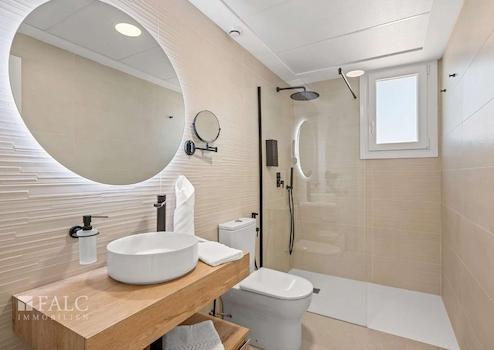 Bäder: Design-Sanitäranlagen aus vitrifiziertem Porzellan, elegante schwarze Armaturen, Fußbodenheizung und integrierte Belüftung.