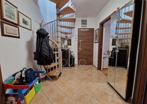 Die Wohnung erstreckt sich über zwei Etagen und besteht aus drei Schlafzimmern, zwei Badezimmern, Wohnzimmer, Essbereich, Küche sowie einer Loggia.