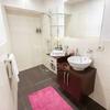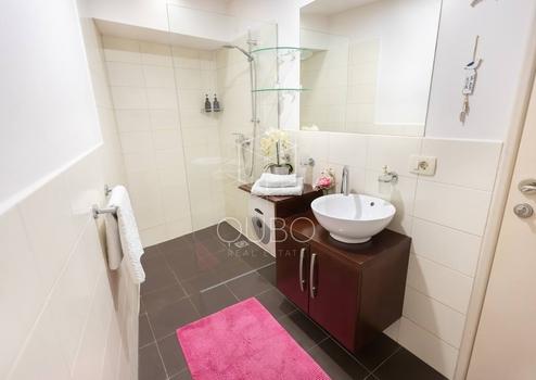 Das moderne Badezimmer verfügt über eine begehbare Dusche und hochwertige Armaturen. Helle Farben und geschmackvolle Details schaffen ein harmonisches Wohngefühl.