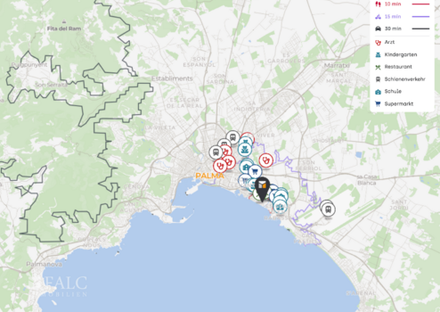 Auch praktische Infrastruktur ist vorhanden: Tankstellen wie BP und Repsol liegen in der Nähe, und für medizinische Versorgung stehen Kliniken wie Sant Joan de Déu sowie das Hospital de Son Llàtzer in gut erreichbarer Distanz zur Verfügung. Insgesamt bietet die Lage eine ausgewogene Kombination aus Alltagstauglichkeit, Freizeitmöglichkeiten und guter Erreichbarkeit.