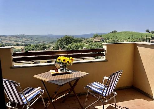 Vom Schlafzimmer, vom Wohnzimmer und auch vom Balkon aus schweift der Blick weit über die sanften Weinberge der Toskana. Morgens taucht die aufgehende Sonne die Landschaft in warmes Gold, abends genießen Sie hier die Ruhe und die besondere Stimmung eines toskanischen Sonnenuntergangs.