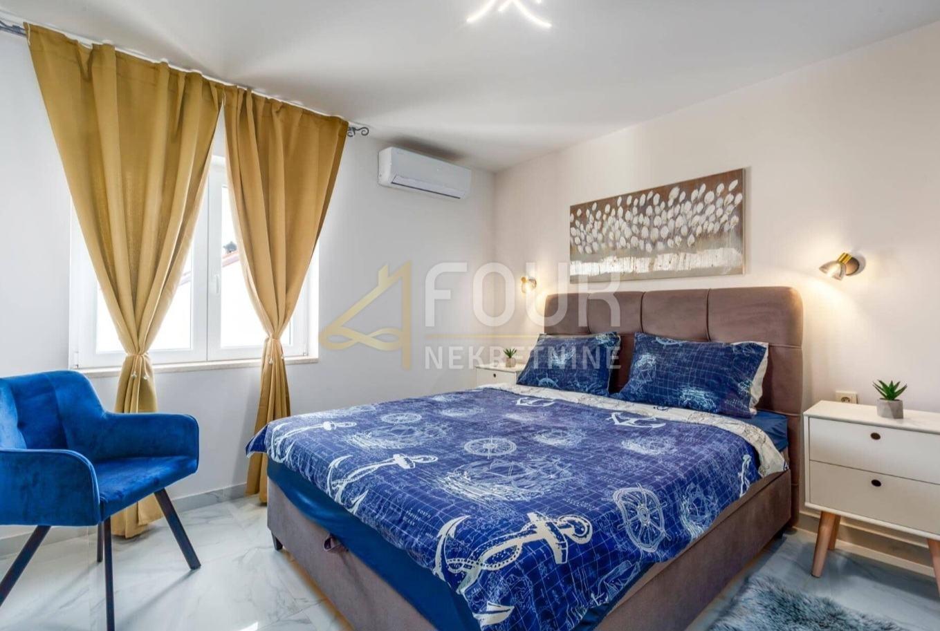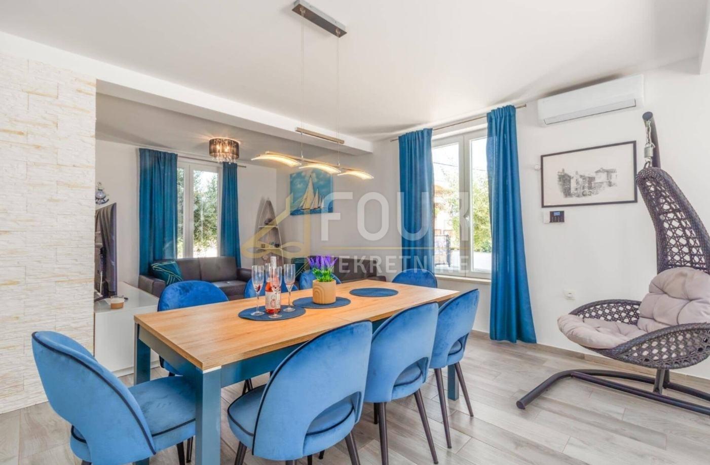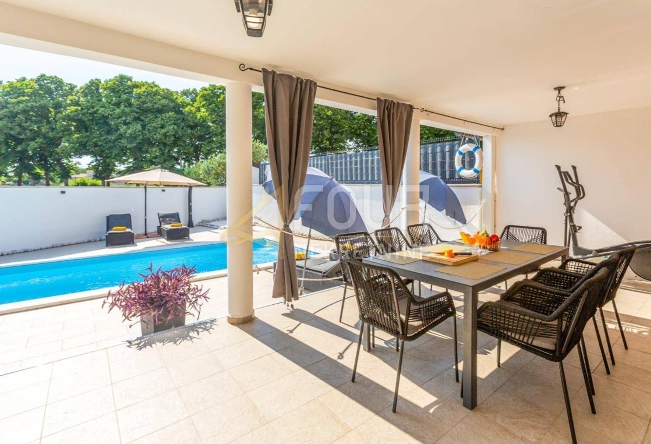 Es wird ein modernes Doppelhaus mit Pool in Marčana in Istri verkauft, an einem ruhigen und angenehmen Ort im Zentrum des Dorfes, nur etwa zehn Kilometer vom Meer entfernt. Das Haus wurde im Jahr 2020 gebaut, mit einer Gesamtfläche von 157 m2, aufgeteilt auf Erdgeschoss und oberer Etage, und befindet sich auf einem 495 m2 großen Grundstück mit einem gepflegten Garten von 369 m2, der Privatsphäre und Entspannung bietet. Das Anwesen ist als eine Wohneinheit mit vier Schlafzimmern und einem geräumigen Wohnbereich konzipiert. Das Erdgeschoss ist im Open-Space-Stil gestaltet und umfasst eine moderne Küche, ein Esszimmer und ein Wohnzimmer, das sich mit großen Glasfronten zur Veranda, zur Terrasse und zum Pool hin öffnet und so viel natürliches Licht und direkten Kontakt zum Außenbereich bietet. Auf derselben Etage befindet sich ein Schlafzimmer mit eigenem Bad. Im Obergeschoss befinden sich drei weitere Schlafzimmer und zusätzliche Badezimmer, sowie ein Balkon mit zusätzlichem Komfort und Blick auf die Umgebung. Der Garten ist eingezäunt und so gestaltet, dass er funktional und leicht zu pflegen ist, wobei der Pool mit einer Fläche von 34 m2 und Sonnenterrasse sowie einem Bereich zum Entspannen und Grillen den zentralen Platz einnimmt. Das Haus ist voll möbliert und modern ausgestattet, einschließlich Klimaanlage, und wird in diesem Zustand verkauft, was einen schnellen Einzug oder fortlaufende touristische Vermietung ermöglicht. Es stehen mehrere Parkplätze zur Verfügung, sogar bis zu fünf Fahrzeuge, was die Praktikabilität dieser Immobilie weiter erhöht. Dank seiner Lage, Bauqualität und Annehmlichkeiten bietet dieses Haus eine ausgezeichnete Gelegenheit für Familienleben, Erholung oder Investitionen im Tourismus.