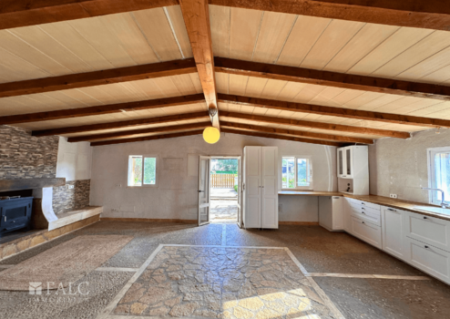 Der offen gestaltete Wohn- und Küchenbereich bildet das Herzstück der Finca. Große Fensterflächen lassen viel Licht herein und verbinden das Innere harmonisch mit der umliegenden Natur. Der Kamin sorgt besonders in den Abendstunden für eine warme, behagliche Atmosphäre – perfekt für entspannte Stunden.