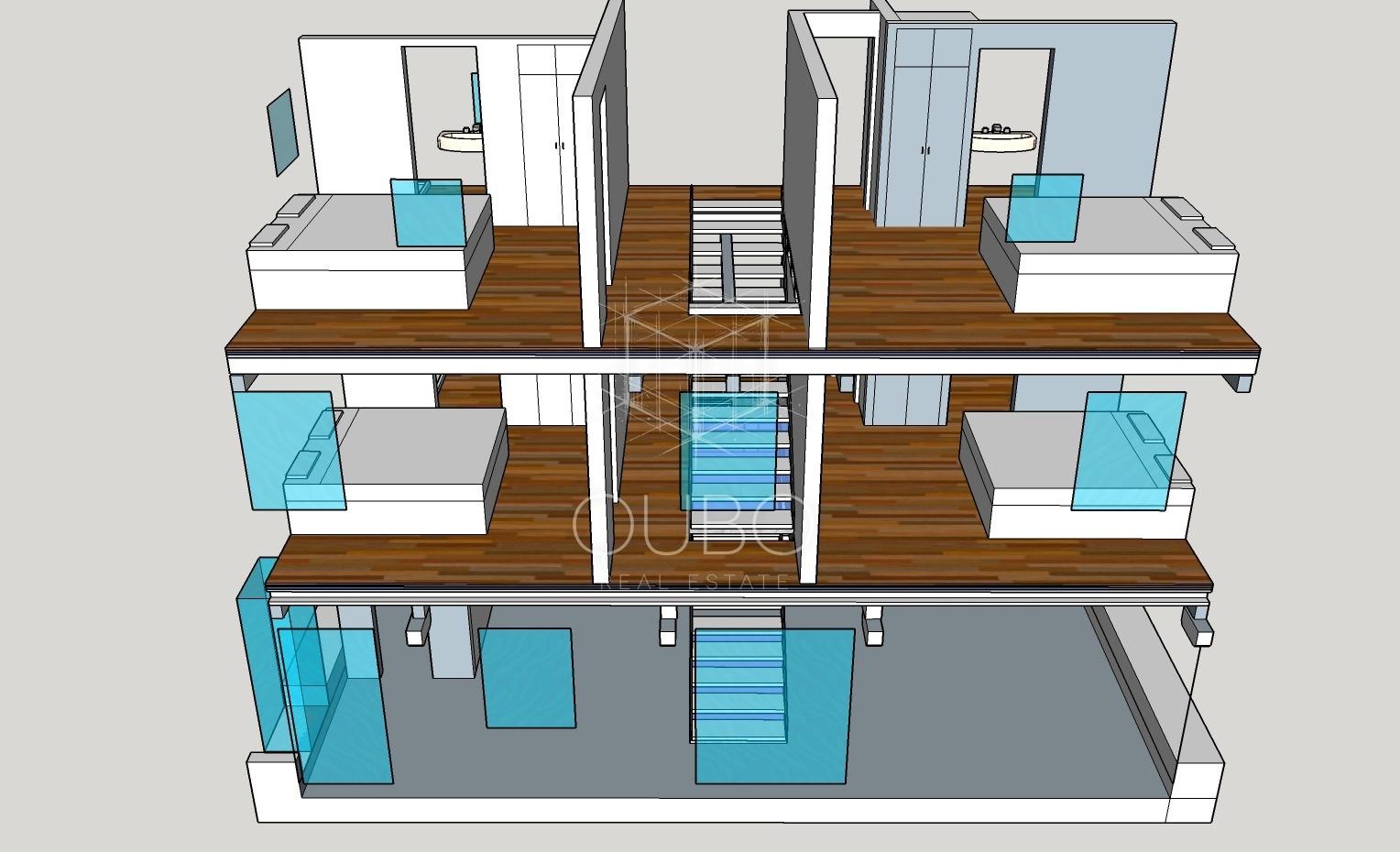 Laut Projekt ist das Erdgeschoss als großzügiger und heller Open-Space-Bereich konzipiert, der Küche, Esszimmer und Wohnzimmer miteinander verbindet und so einen idealen Raum für den Alltag und gesellige Zusammenkünfte schafft. Im ersten Stock sind zwei komfortable Schlafzimmer vorgesehen, jeweils mit eigenem Badezimmer. Im Dachgeschoss werden sich zwei weitere Schlafzimmer befinden, ebenfalls mit eigenen Badezimmern, wodurch maximaler Komfort und Privatsphäre gewährleistet werden.
