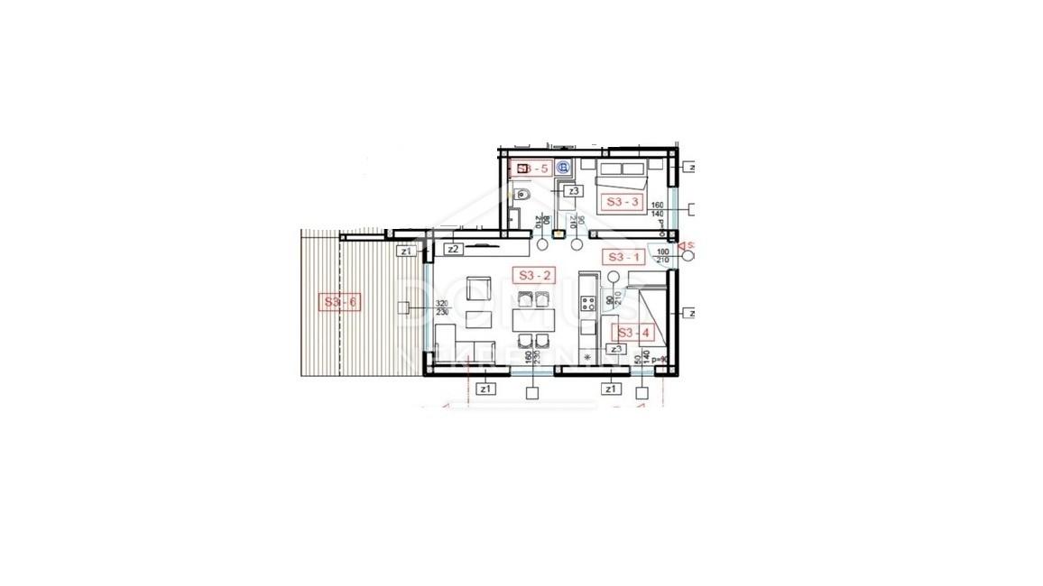 Das Apartment S3 befindet sich in einem kleineren Wohngebäude Z1 mit insgesamt 6 Apartments. Es liegt im Erdgeschoss, zeichnet sich durch modernes Design und eine funktionale Raumaufteilung aus und verfügt über eine gesamte Nutzfläche von 80,19 m².