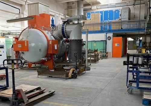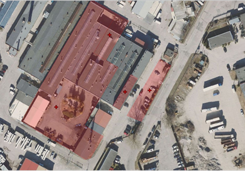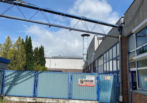 Produktionshalle mit einem Portalkran auf einem großem Grundstück