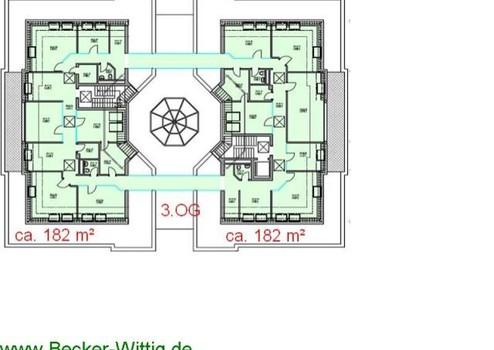 3. OG insges. ca. 364 m², mit zwei Teilflächen von jeweils ca. 182 m² mit aktuell jeweils 8 Räumen.