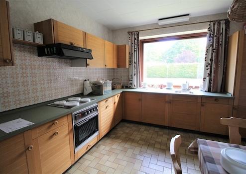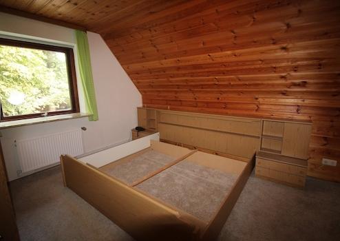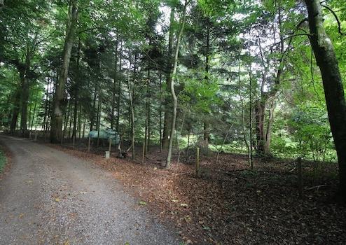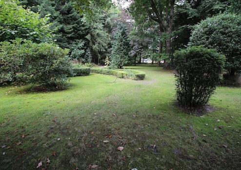 Es liegt direkt an einem Forst gelegen. Mehrere Laubbäume und Tannen zieren den Garten.