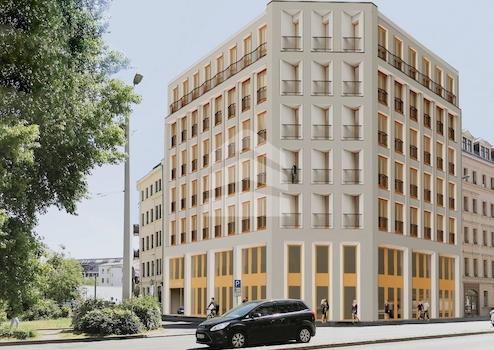 Der ca. 2.420,00 m² umfassende Bürokomplex erstreckt sich mit einem Gebäudeteil zur Eutritzscher Straße, mit dem anderen Flügel zum Wilhelm-Liebknecht-Platz. Bodentiefe Fenster bewirken eine lichtdurchflutete Ausstrahlung. Die Anbringung der französischen Balkone ermöglicht Ausflüge ins Freie, ohne das Büro zu verlassen. Das Neubauprojekt verfolgt einen edlen und modernen Stil und schmiegt sich dank der hellen Außenfassade ideal ins Bild der anliegenden Häuserreihe. Stellplätze stehen in der hauseigenen Tiefgarage zur Anmietung zur Verfügung. Im Objekt werden folgenden Flächen zur Verfügung stehen: