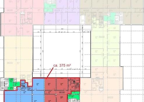 Der imposante Bürokomplex mit seiner Glasfassade wurde Mitte der 90iger Jahre errichtet und besteht aus 4 separaten Gebäuden mit insgesamt ca. 54.000,00 m² Bürofläche. Die einzelnen Büroetagen sind über verschiedene Eingangsbereiche mit Aufzugsanlagen erschlossen. Der angebotene Mietbereich von ca. 375,00 m² befindet sich im Erdgeschoss und kann nach dem Raumprofil des Mieters ausgestattet und ausgebaut werden. Die Flächen verfügen über folgende Grundausstattung: