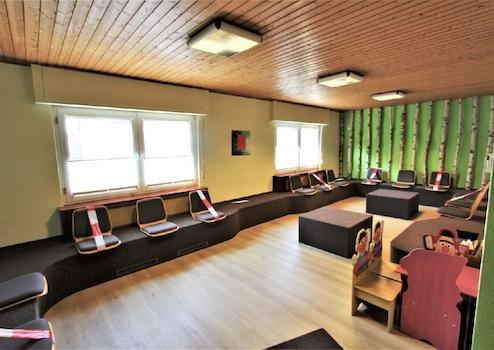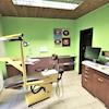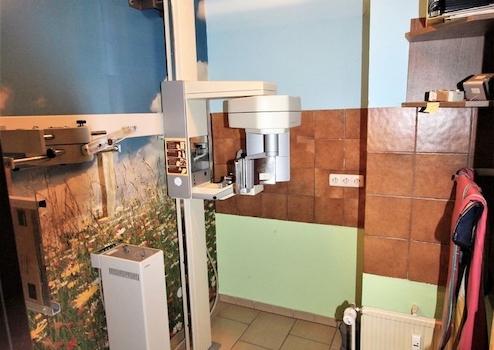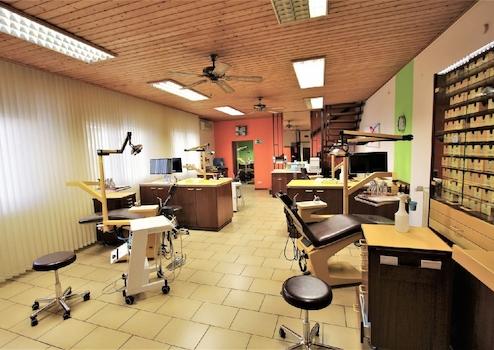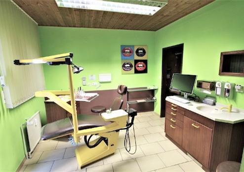 Der Eingangsbereich mit zentralem Empfang, nach links das große Wartezimmer und geradeaus in die Arbeitsräume, dazwischen die Toilette. Die Arbeitsräume teilen sich auf in großer und kleiner Behandlungsraum und ein Büro mit angrenzenden kleinen Lager. Das Erdgeschoss verfügt über ca. 160m² Fläche.