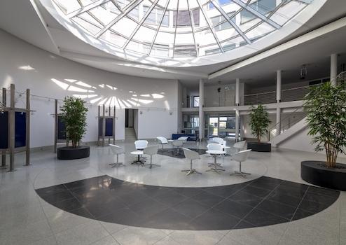 Das 6-geschossige Bürogebäude verfügt über vier Eingänge und zwei Treppenhäuser. Der Haupteingang ist durch einen repräsentativen Veranstaltungs- und Vortragssaal mit Raumakustik und großer Leinwand geprägt.