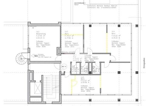 Die Nutzlast der Geschossdecken beträgt 5 kN/m². Die Flur- und Bürotrennwände berücksichtigen ein Bauschalldämm-Maß von R´W = 37 dB. Eine EDV-Verkabelung ist vorhanden. Die Verkabelung erfolgt in Fenstersockelkanälen oder geschlitzt unterhalb des Fußbodenbelages. Ohne Angaben bezogen auf einen Belegungsplan werden pro Achse 3 Schukosteckdosen (AV-Netz) und 3 Schukosteckdosen (EDV-Netz) sowie 3 x RJ 45 EDV Dosen vorgehalten.