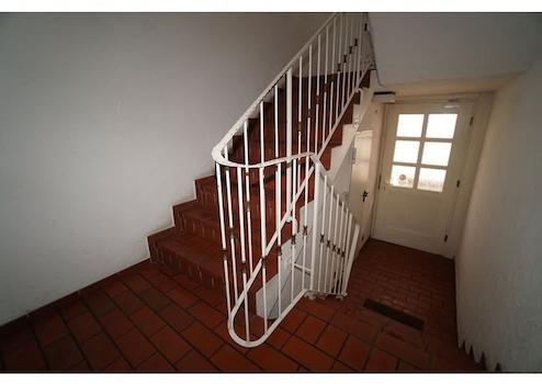 Hauseingang/Treppenhaus: Hauseingangstür aus Holz mit Glasausschnitt, massive Geschosstreppen mit Zwischenpodesten und Metallgeländer.